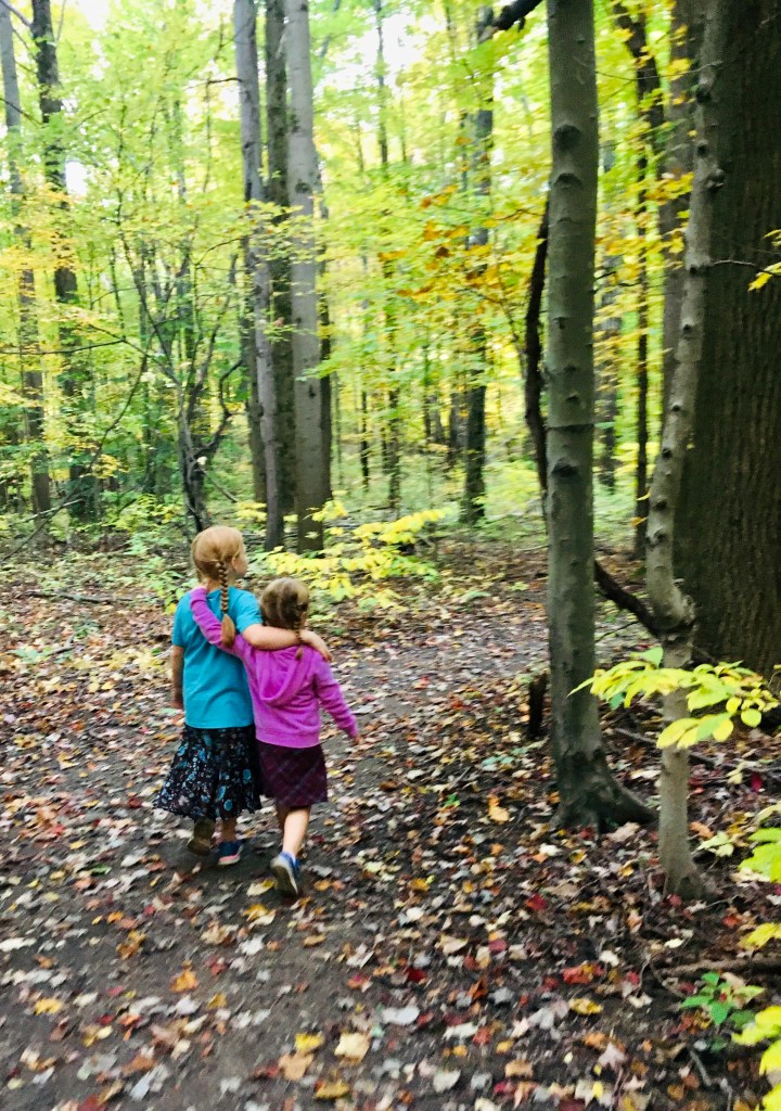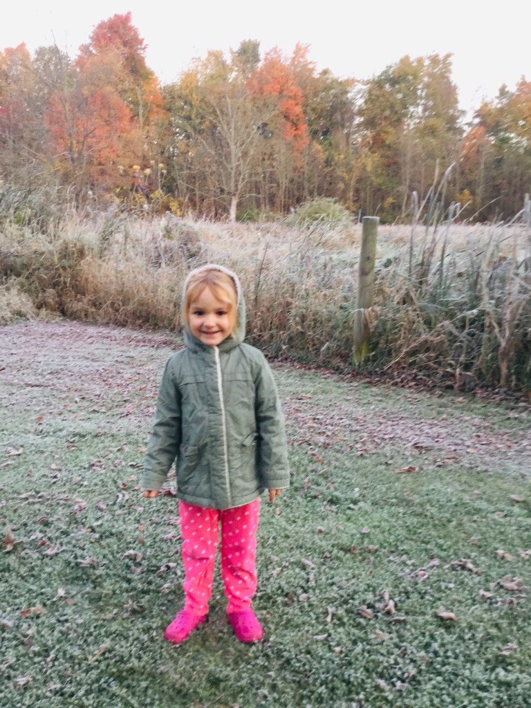 It has been such a lovely fall season, we are enjoying it! ๐ The little girls are in continual wonder of the beautiful fall colors, exclaiming in delight, collecting leaves and acorns. They have tried repeatedly to rake the few leaves that have fallen, into a pile, but with no success, yet. Our first frost filled them with a new wonder, as they admired the delicate white crystals outlining every blade of grass and fallen leaf. ๐