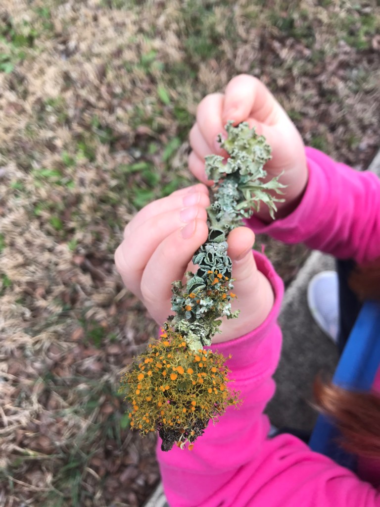 Evelyn, fascinated by the colorful fungus growing on this stick.