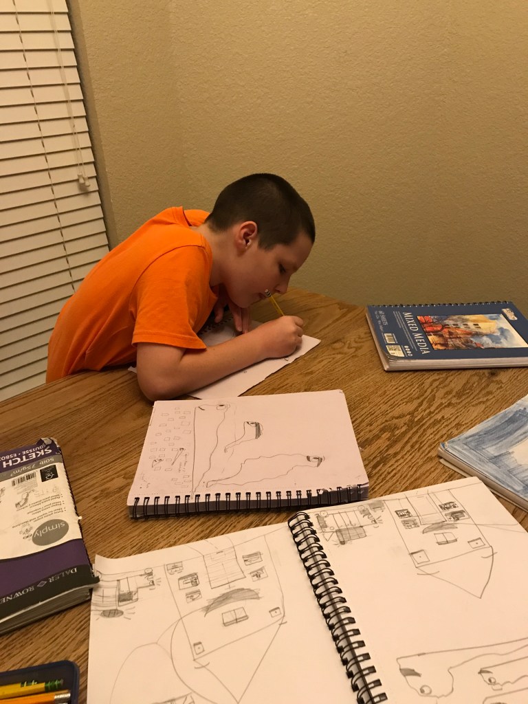 Our artist…at work…filling up one book with pictures, after another. We are thankful when he starts to draw…