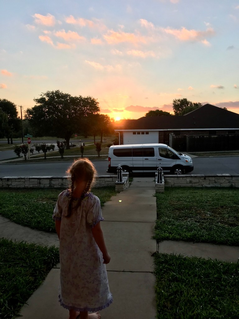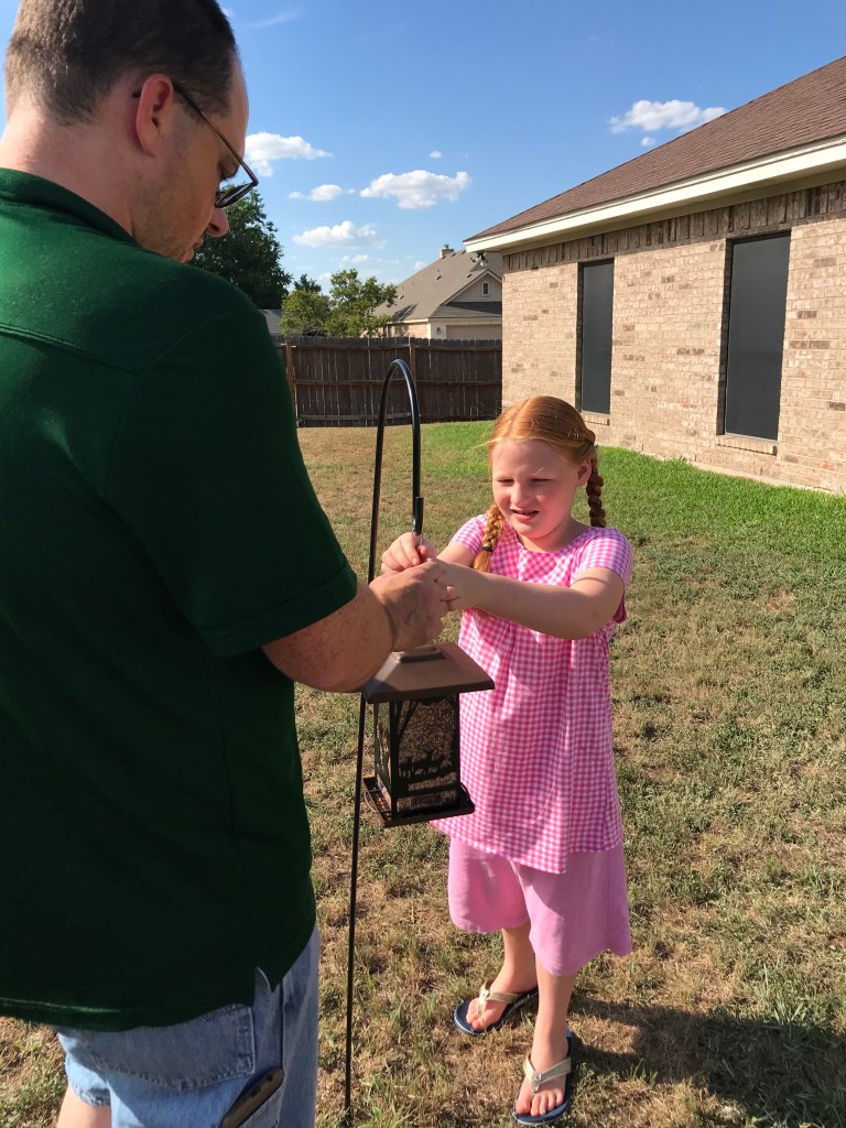 Evelyn loves birds and was given a bird feeder this summer…Daddy helping her find the right place to hang it.